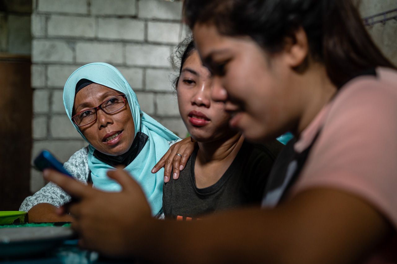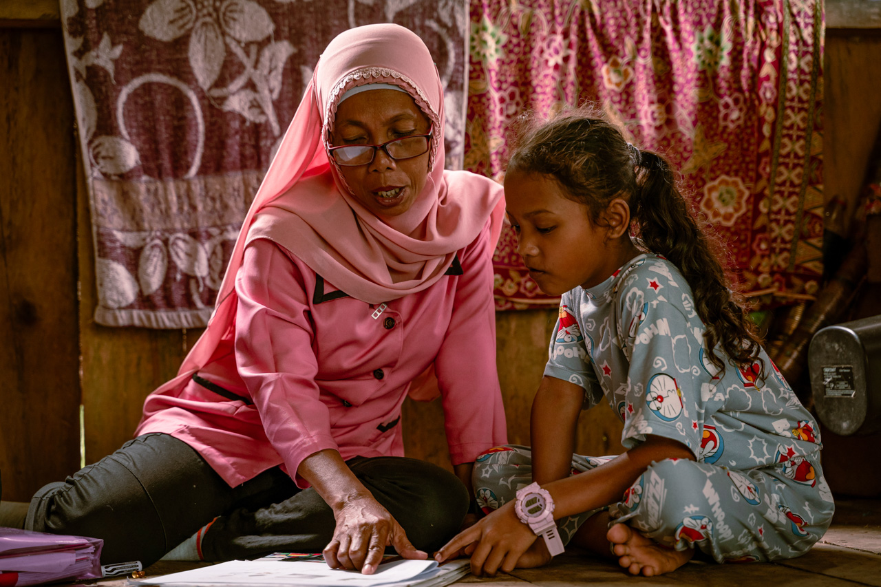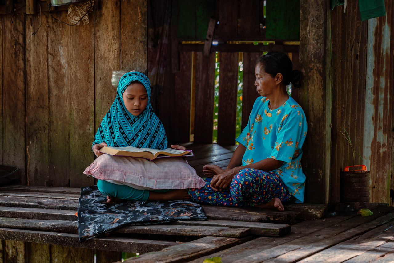 Sitting in one corner of the house, Marsila and Sidang began their lessons. The young girl recited with confidence and enthusiasm. Sidang brought out her picture book of letter associations and leafed through the pages. A is for apple. B is for ball. C is for cat. “Kuting!” Marsila exclaimed. Their own cat gave birth to four kittens recently, she shared. D is for drum. “Tambol!” Marsila said, pretend playing on a set of invisible drums. E is for elephant. Marsila paused, marveling at the picture.