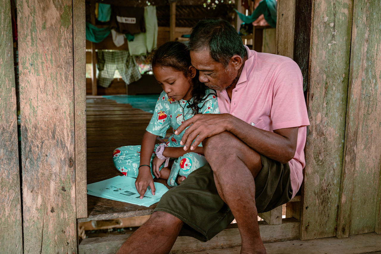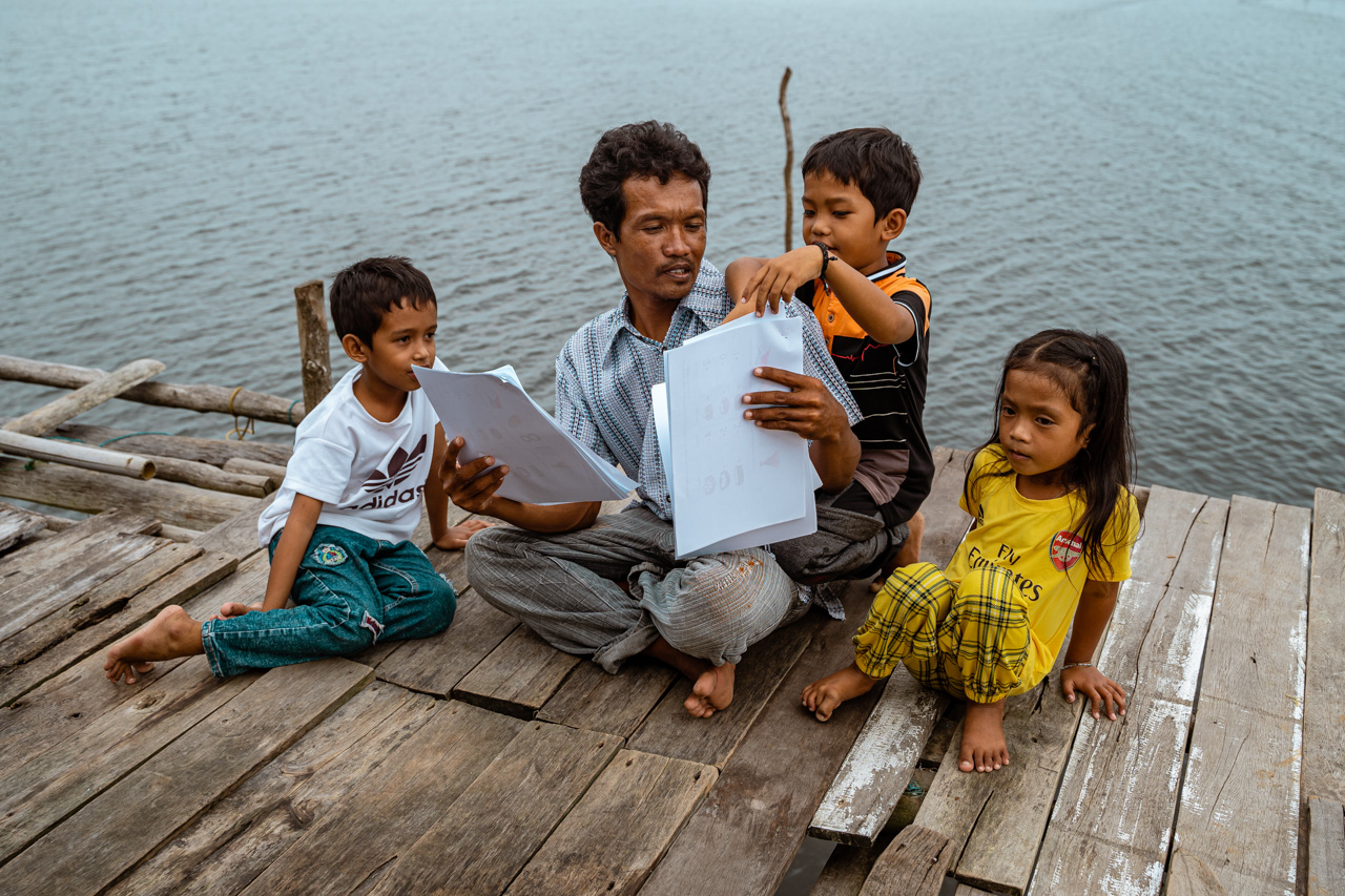 We arrived at a cluster of homes linked by narrow wooden gangways. Eight children were already gathered in an open area, eager but well-behaved. Their parents, sitting in a loose huddle, were here for the lessons too. Presently, a middle-aged man moved closer to the children, settling behind one of the boys. This was father and son, learning to read and write together.